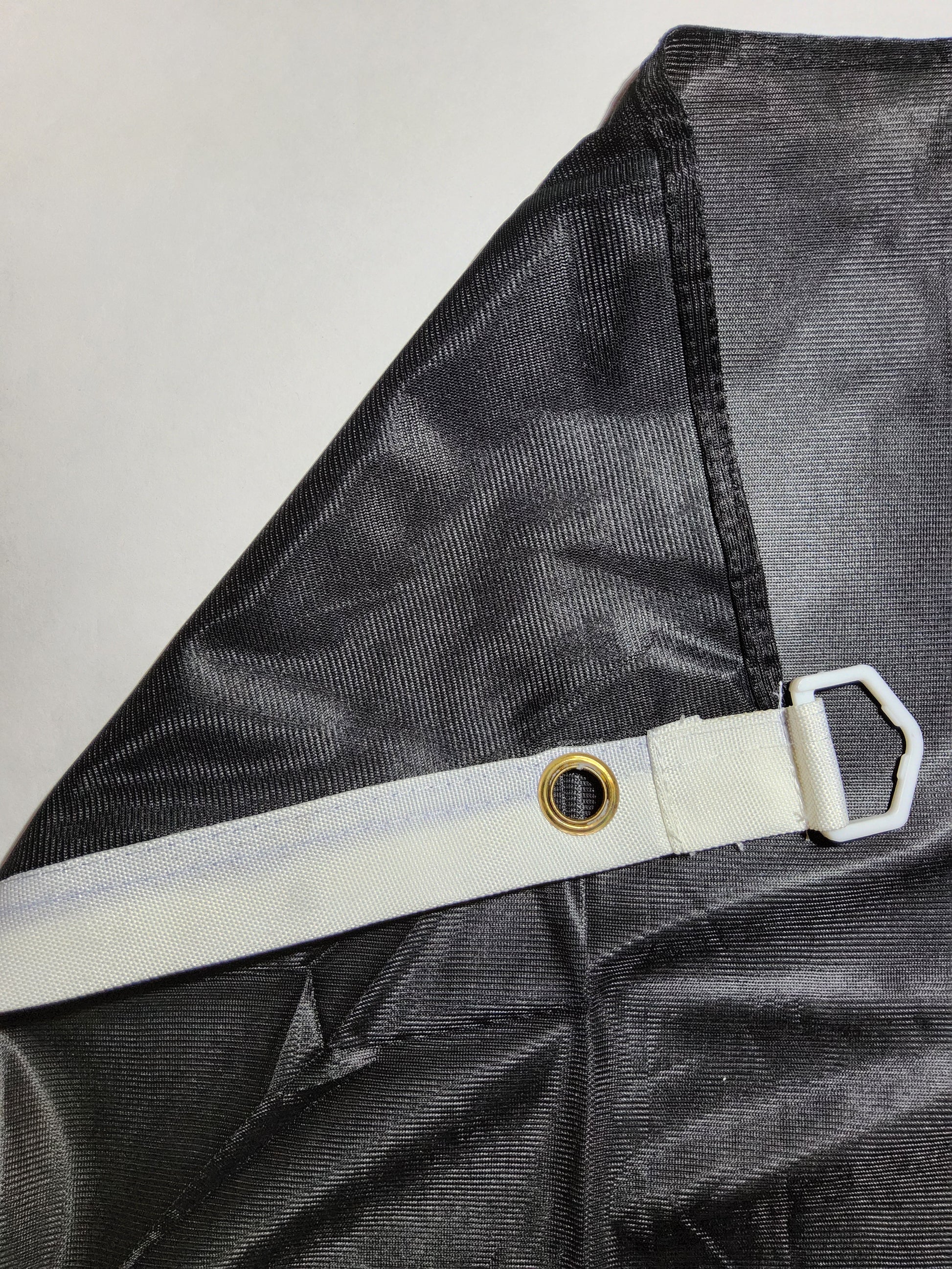 : brass grommets + plastic D rings to securely hang flag
